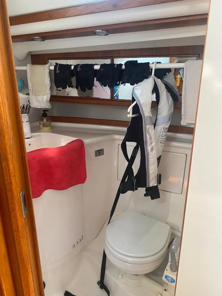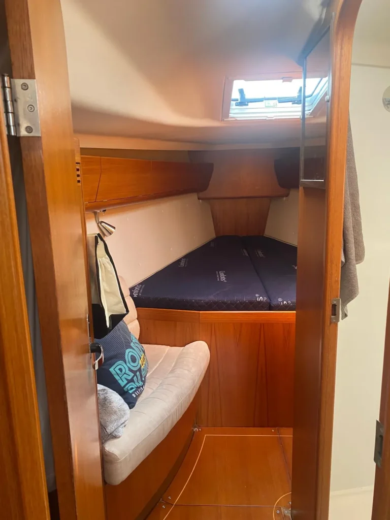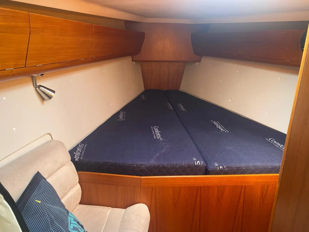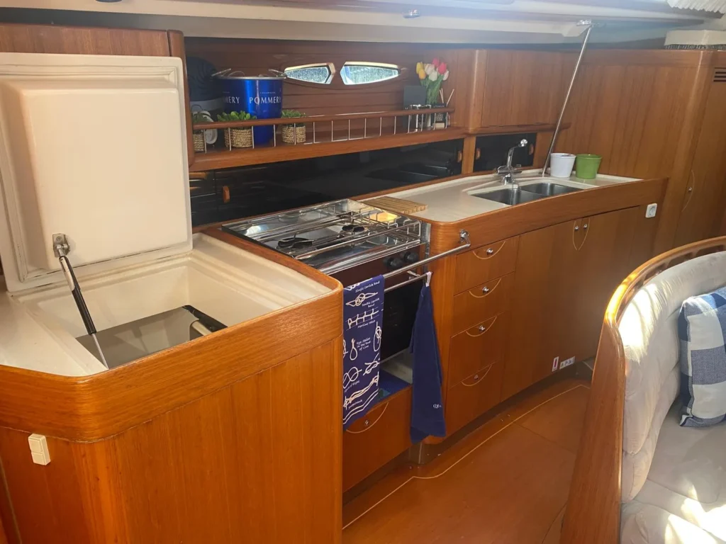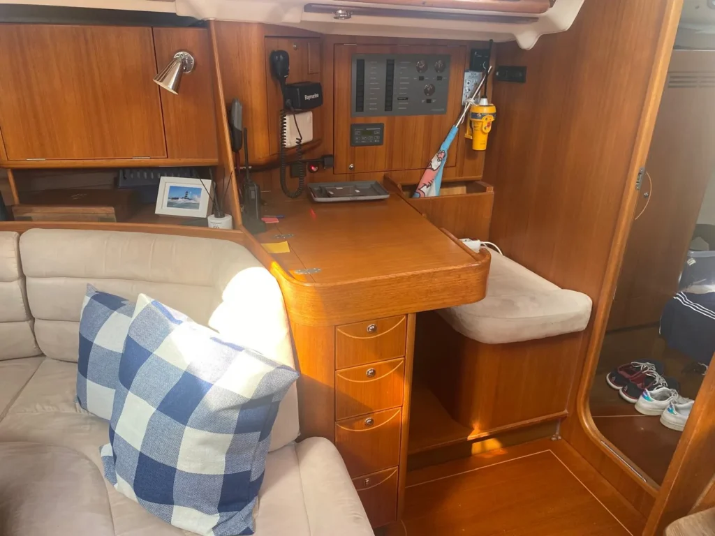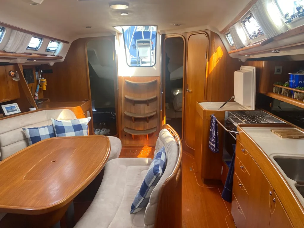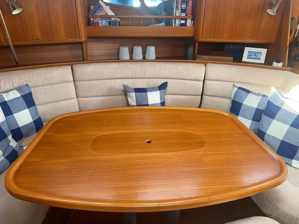 Beneden biedt het jacht een teak interieur met een praktische indeling van drie hutten en twee natte cellen, waarvan één met elektrisch toilet. De kombuis bevindt zich aan bakboord en vernieuwingen zoals nieuwe bekleding, een vernieuwd fornuis en een geüpdatet verwarmingssysteem dragen bij aan het comfort aan boord.