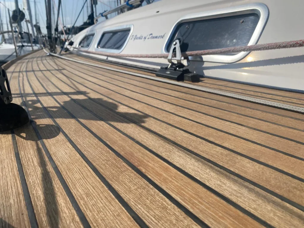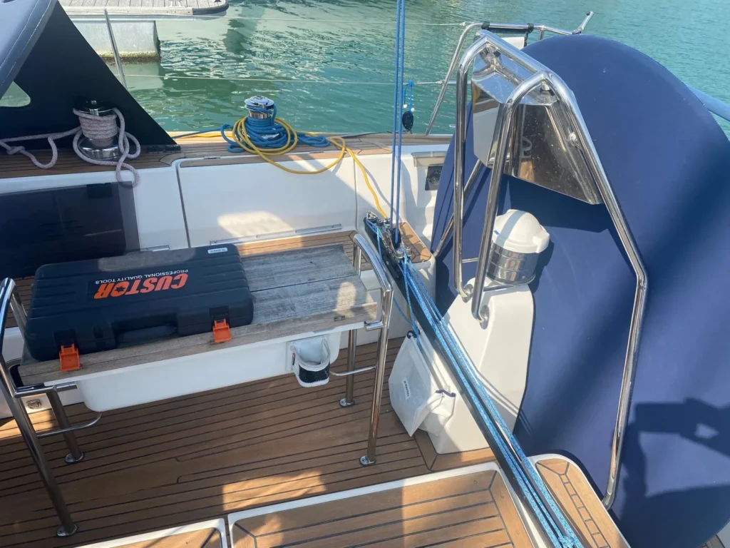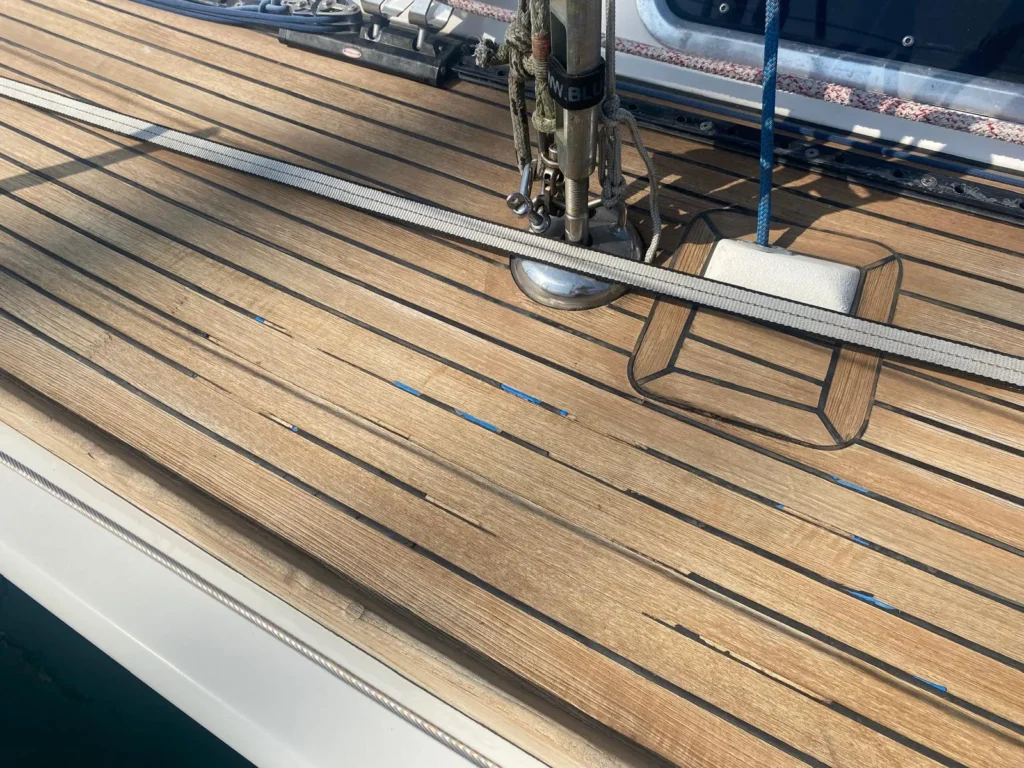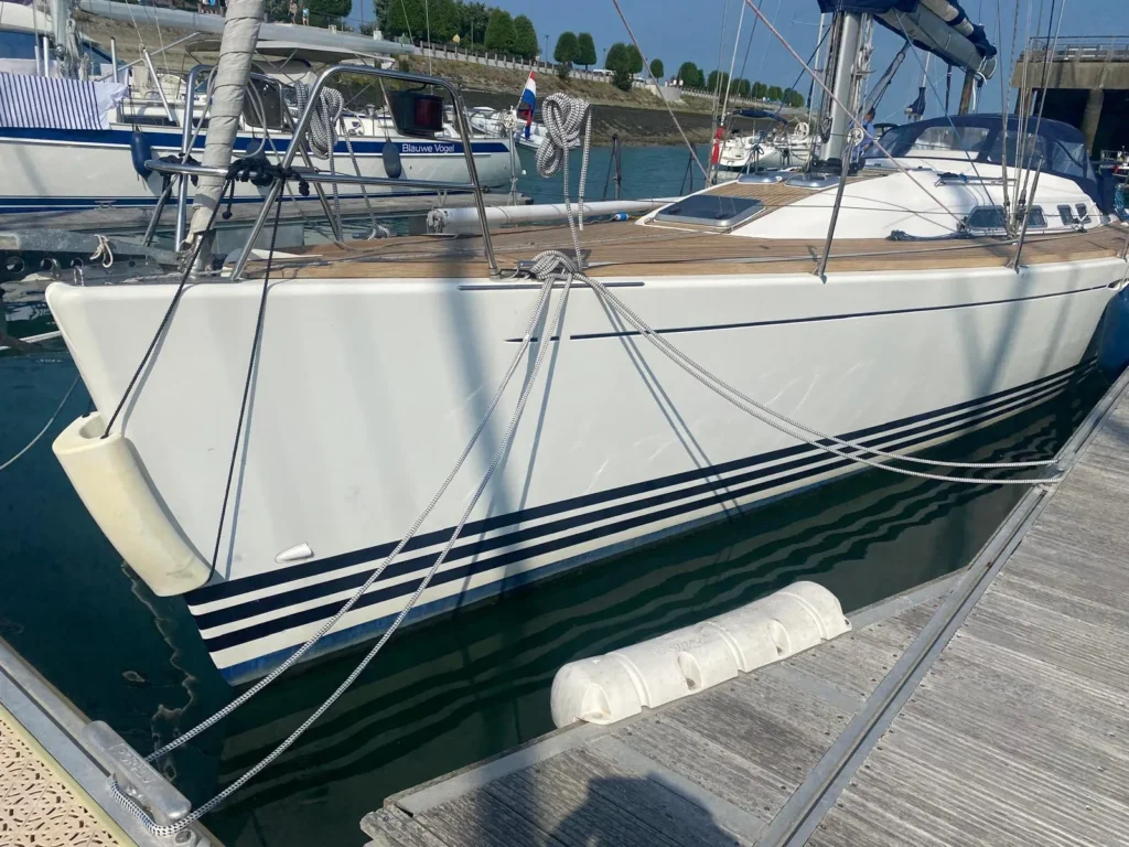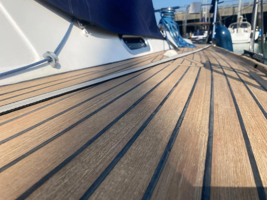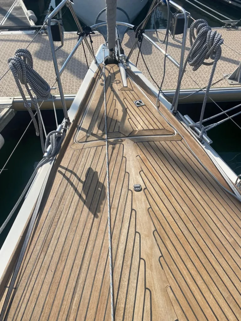 De witte romp met donkerblauwe striping heeft in het voorjaar van 2023 een volledige onderwaterbehandeling gekregen, inclusief nieuwe epoxybescherming en antifouling. Teakdek is aanwezig in de kuip, op de gangboorden en het kajuitdak; het teak verkeert over het algemeen in een redelijke staat, maar dient plaatselijk te worden nagezien en onderhouden. Een carbon stuurwiel, sprayhood met nieuw doek (2024) en een elektrische ankerlier zorgen voor extra gebruiksgemak en comfort.
