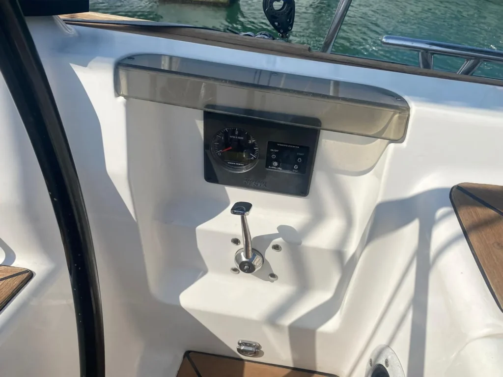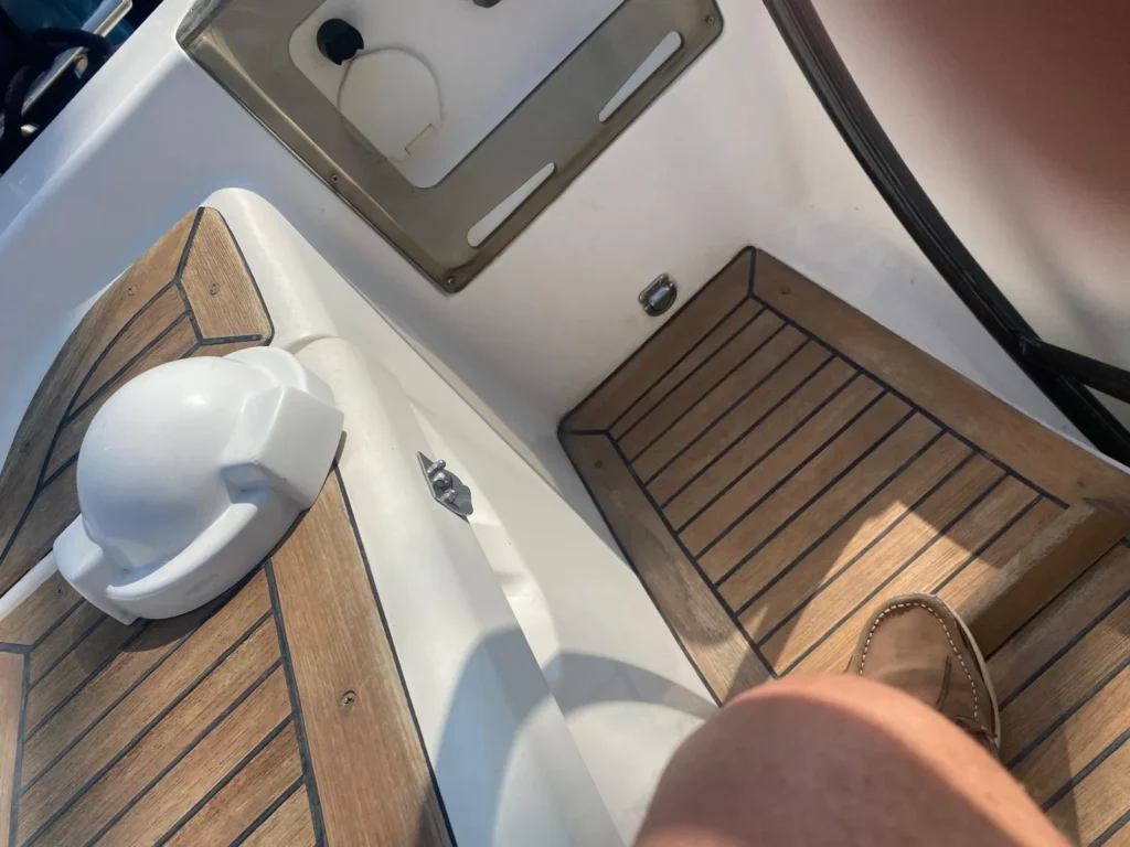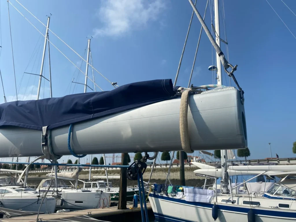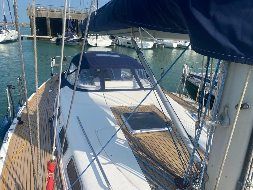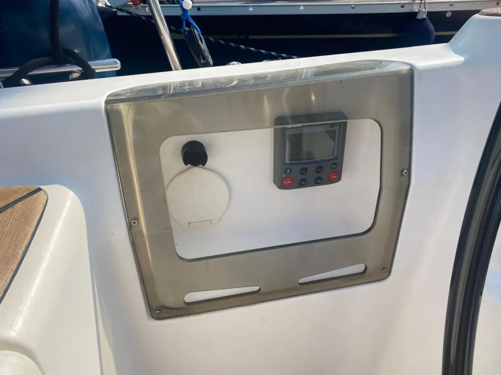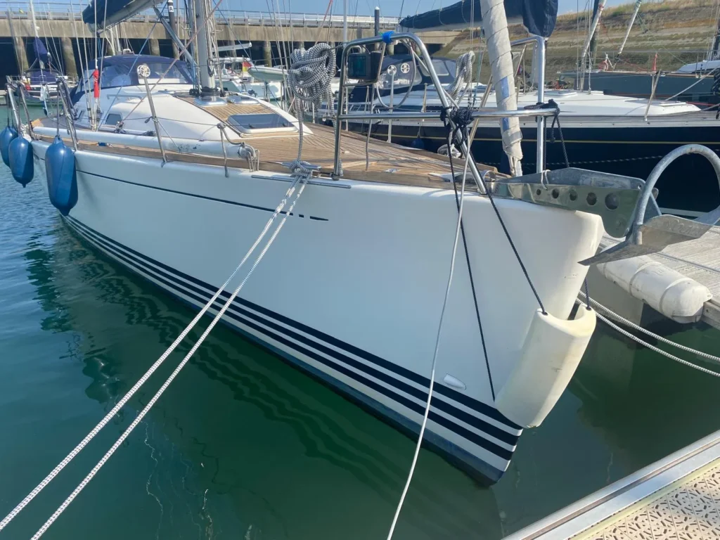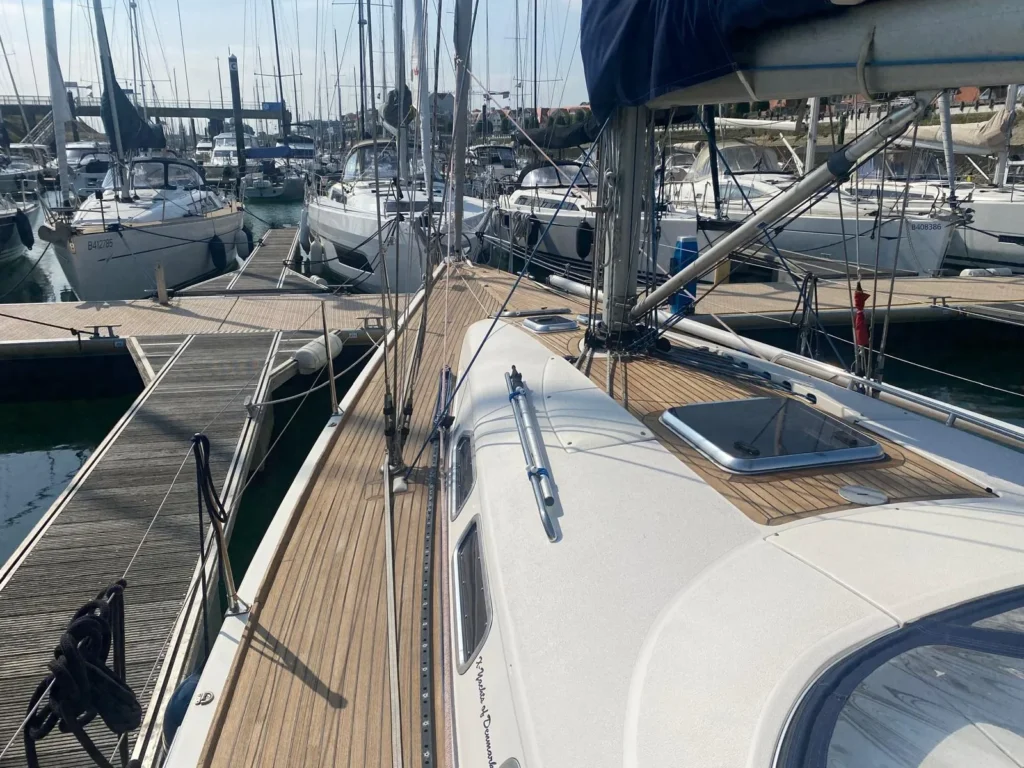 De witte romp met donkerblauwe striping heeft in het voorjaar van 2023 een volledige onderwaterbehandeling gekregen, inclusief nieuwe epoxybescherming en antifouling. Teakdek is aanwezig in de kuip, op de gangboorden en het kajuitdak; het teak verkeert over het algemeen in een redelijke staat, maar dient plaatselijk te worden nagezien en onderhouden. Een carbon stuurwiel, sprayhood met nieuw doek (2024) en een elektrische ankerlier zorgen voor extra gebruiksgemak en comfort.