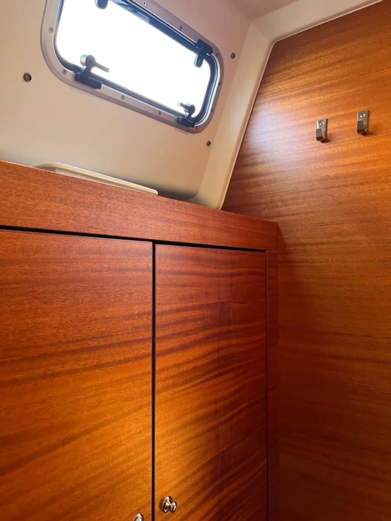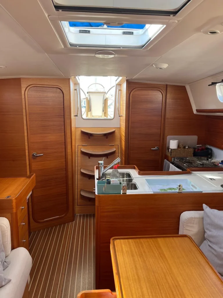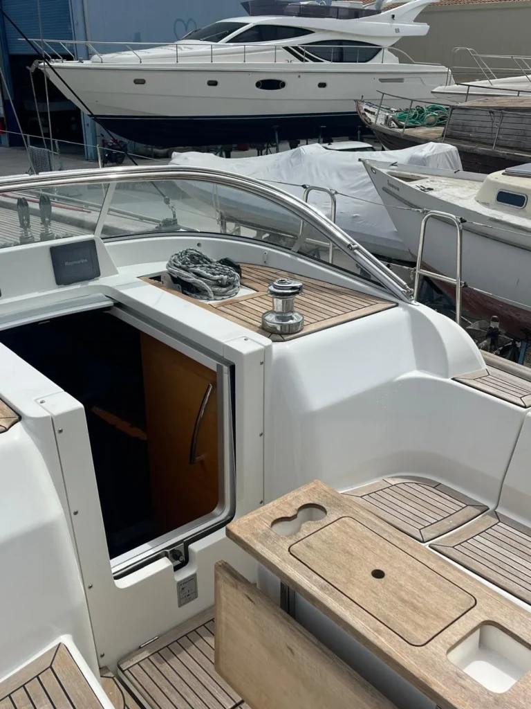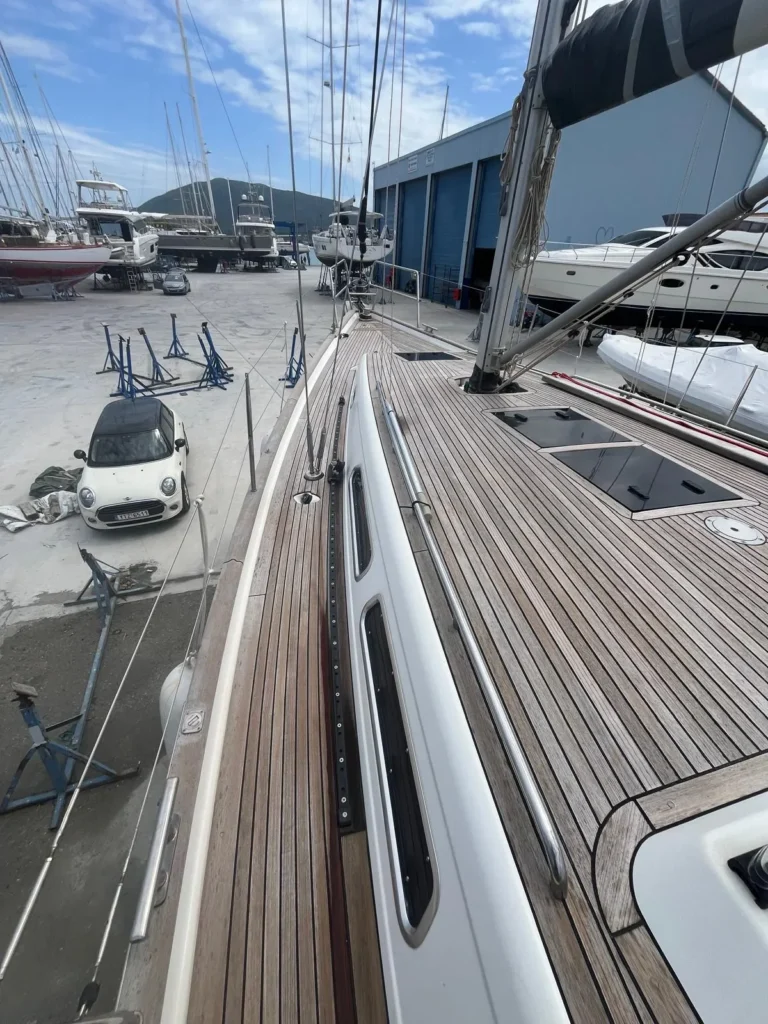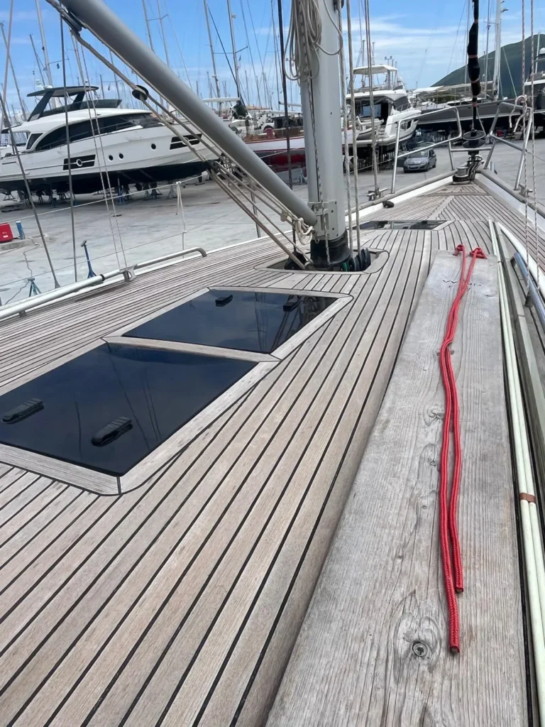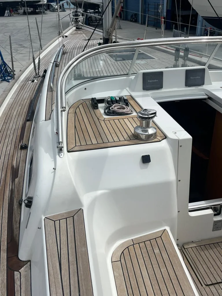 Teak in de cockpit + zwemplatform, op de zijdekken en op het coachroof